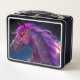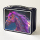 Cette boîte à lunch a un cheval violet dessus.