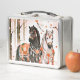 Cheval noir et cheval blanc dans une forêt d'automne rouge.