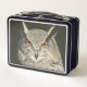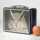 Un crayon de couleur et un dessin au stylo d'une Grande Chouette à la corne avec des yeux orange percés ornent cette boîte à lunch amusante!