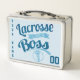 Lacrosse Métal À Déjeuner Tin. Ajoutez votre propre nom et numéro à la boîte à lunch pour faire une grande boîte personnalisée, pour l'école, l'université, le bureau ou les voyages! Il suffit d'utiliser les zones de texte situées à droite de l'image. Conception de script dans les tons bleus avec le texte LACROSSE LIKE A BOSS et un bâton de crosse et graphique à billes.