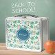 La boîte à lunch pour enfants à thème Dinosaur comprend un motif de Tyrannosaurus mignon (T-Rex), Tricératops, feuilles de monstères tropicales, palmiers, volcan et "Roar !" texte. Personnalisez-le avec le nom ou les initiales de votre enfant pour un plaisir de retour à l'école cadeau. Art par KL Stock.