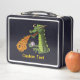 Dessin de dragon vert tenant une ampoule à ail. La flamme avec le mot ail sort de sa bouche. Texte personnalisé des deux côtés.
