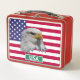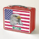 Montrez votre patriotisme avec cette Lunch Box avec la bannière étoilée des Etats-Unis avec une image d'aigle chauve de chaque côté. Le texte peut être modifié selon vos besoins.