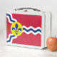 Lunch Box avec le drapeau de la ville de Saint-Louis; drapeau rouge avec vagues blanches et bleues et fleur de lys bleu en cercle jaune