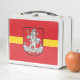 Lunchbox en métal avec design avec le drapeau de Vilnius, capitale de la Lituanie ; drapeau rouge avec bande jaune et armoiries avec deux lions d'or tenant un bouclier au centre