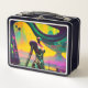 Cette boîte à lunch robot de science-fiction rêveuse comprend deux tableaux du surréaliste américain Ken Gage. Sur le devant se trouve Bridge Over the Robot Kwai. Sur le dos, Rêveur Psychaéronautique. Idéal pour un congrès fourre-tout ou juste une visite de collation régulière à votre sanitarium local.
