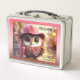 Boîte à lunch avec l'illustration d'une chouette encadrée de rose girly.