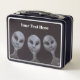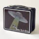 Un dessin au crayon couleur d'une vache malheureuse enlevée par des aliens dans une soucoupe volante orne un côté de cette boîte à lunch personnalisable ! L'autre partie est composée d'un dessin en crayon couleur de trois Gris Aliens.
