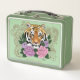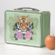 Portrait tigre aux fleurs rose et violet clair. Du henné tout autour du tigre dans un décor de vert.