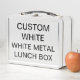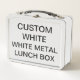 La coutume a imprimé le modèle personnalisé de blanc de GAMELLE EN MÉTAL BLANC - 6,75" haut x 8,625" au loin x 3,75" profondément, poids : 12 onces. La conception, créent, font vos propres. Votre photo, image, texte, logo, graphiques dans la copie polychrome d'un côté ou des deux côtés du panier-repas. Matériel intérieur sûr de contact de nourriture, biens - plainte de CPSIA - fer-blanc, avec la poignée en plastique noire pliante. Choisissez de 6 couleurs basses : Blanc, inoxydable, noir, bleu-foncé, bleu-clair et rouge.