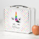 Le Glam Rainbow Unicorn Metal Lunch Box conçu par Enchantfancy Design Company présente le contour du visage d'une licorne avec des cils glamour, des oreilles, un touft de cheveux et une fabuleuse corne de licorne arc-en-ciel. Un motif d'étoiles arc-en-ciel met l'accent sur l'arrière - plan. Personnalisez avec votre choix de nom ! Cette boîte à lunch joyeuse fait un cadeau parfait.