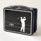Cette boîte à lunch caractéristique est dotée d'un golfeur blanc en pleine balançoire. Sur le tiers inférieur est votre monogramme en blanc encadré par de fines lignes blanches. Le texte et l'image sont placés sur un arrière - plan noir dramatique. Les deux côtés ont la même image et le même texte.
