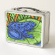 Cette boîte à lunch en métal est munie d'une grenouille bleue éclatante, tachetée de noir, assise sur un tapis vert vif entouré de pales d'herbe et de plantes de roseaux jaunes à l'avant et à l'arrière.