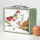 This hilarious illustration captures the precise moment the Grinch decides his dog needs an upgrade! The Grinch, dressed in his full, fuzzy Santa suit, is meticulously tying a single reindeer antler onto the head of his dog, Max, using a piece of string or yarn. Poor Max looks utterly resigned to his fate as the "reluctant reindeer." This fun, classic illustration perfectly highlights the absurd and mischievous planning behind the famous Christmas heist!