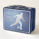 Un joueur de football en silhouette argentée est sur le point de lancer la balle sur cette boîte à lunch métallique. La figure est placée sur un arrière - plan abstrait bleu, faux texturé. Votre nom ou autre texte est en bleu foncé à gauche de la silhouette. Les deux côtés ont le même design et le même nom.