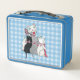 Cette boîte à lunch en métal a une chatte mère blanche heureuse assise avec ses trois chatons noirs, blancs et gris qui portent des arcs roses sur un arrière - plan plaid bleu et blanc.
