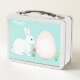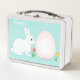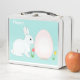 Joli lapin, oeuf et fleurs sur la Lunch Box bleu clair.