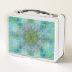 Des couleurs chatoyantes de vert, turquoise, bleu, violet et magenta créent un motif kaleidescopique magnifique et unique sur cette belle lunchbox. Et ce n'est pas seulement* une boîte à lunch : elle peut contenir vos peintures et outils d'art, vos cosmétiques, vos cachettes et lettres secrètes, tout ce qui convient ! Photo de DeGruy.