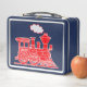 Gamelle rouge lumineuse en métal de train de locomotive à vapeur d'amusement parfaite pour un jeune enthousiaste de train, un constructeur modèle de train ou un crétin. Customisez avec votre propre nom sur le train. Lit actuellement des terriers. Illustration et conception de Sarah Trett pour www.mylittleeden.com sur le zazzle.
