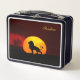 Silhouette de lion sauvage, lever du soleil et calligraphie sur une Lunch Box jungle. Le soleil se levant sur une jungle est magique !