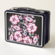 Ce graphique floral, est présenté dans un motif de diamant, avec des grappes de fleurs, pétales et feuilles, en teintes muettes de ; rose, fuschia, lavande, mauve, vert et blanc sur fond de noir.