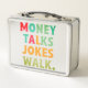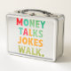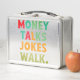 Une image vibrante, de style dessin animé, représentant l'argent comme un personnage de conversation, probablement vêtu d'un costume et d'une cravate, avec une bulle de discours contenant l'expression "Money Talks." Un deuxième personnage, représentant des blagues, s'éloigne, peut-être avec une expression humoristique. L'arrière - plan peut être un dégradé coloré ou une couleur simple et solide. Le design général devrait être ludique et attrayant, reflétant la nature humoristique de l'expression.