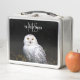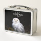 Portrait animal photo d'une majestueuse chouette enneigée debout sur une branche avec un nom personnalisé personnalisé monographie ci-dessus.