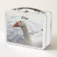 Des photos d'une oie blanche d'un côté et d'un canard à bois mâle de l'autre ornent cette boîte à lunch personnalisable !