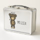 Boîte à lunch personnalisée avec une simple illustration d'un ours brun caricaturé tenant une marguerite jaune. Bonjour écrit au-dessus de sa tête.