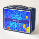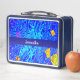 Ce design présente un arrière - plan bleu foncé avec des tourbillons bleu clair et des pièces jaunes sur les boîtes à lunch