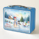 Peter the rabbit in a snowy landscape with ginger bread house, snowman and lolly pops