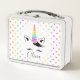 Le Pretty Pastel Unicorn Metal Lunch Box conçu par Enchantfancy Design Company présente un visage de licorne sucré avec de gros cils et une corne de licorne d'arc-en-ciel pastel. Un motif d'étoiles arc-en-ciel pastel met l'accent sur l'arrière - plan. Personnalisez avec votre choix de nom !