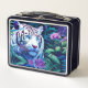 tigre blanc aux yeux bleus dans les feuilles tropicaux et les fleurs violettes AI Art par minx267