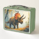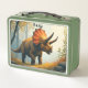 Un Tricératops marche à travers une forêt préhistorique sur cette boîte à lunch pour un petit garçon ou une petite fille qui aime les dinosaures.