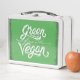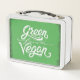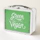 Une lunchbox en métal blanc avec une poignée noire et un verrou en argent est affichée contre un arrière - plan neutre. L'avant de la lunchbox comporte un panneau vert avec les mots "Green Fresh Vegan" écrit dans une police blanche stylisée et cursive. Le panneau vert a un aspect légèrement déprimé ou texturé, avec des bords plus foncés qui lui donnent un effet vintage ou de tableau noir. Le lettrage blanc est orné, avec des fioritures et des tourbillons qui ajoutent à l'attrait visuel du design. La lunchbox elle-même a des bords arrondis et une finition brillante, reflétant la lumière et lui donnant un look propre et moderne. La poignée est en plastique noir avec une poignée texturée, et le loquet en argent est simple et fonctionnel. L'ensemble est propre et lumineux, avec une attention particulière portée à la lunchbox et à son design.