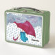 Une journée pluvieuse avec tous les éléments. Gary ciel nuageux, gouttes de pluie, parapluie rouge et bottes de pluie bleue. Les Lunchboxes sont disponibles en sept couleurs, y compris en inox. Le texte peut être customisé.
