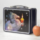 Une lunchbox en métal noir avec des dessins de dragons heureux qui admirent des bougies, par Melody Pena.