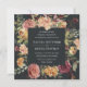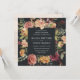 Notre invitation de mariage Lune Jardin dans un format carré unique encadre vos détails mariages avec des roses et des mamans aquarelles peintes dans les tons d'automne de bordeaux, marsala, rose roux et pêche, avec feuillage vert foncé et feuilles. Un choix élégant pour les mariages d'automne ou d'hiver, avec des fleurs luxuriantes sur un arrière - plan noir spectaculaire.
