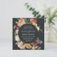 Notre invitation à un mariage dans un format carré unique encadre vos détails mariages avec un cercle de roses et mamans aquarellés peints dans les tons d'automne de bordeaux, marsala, rose roux et pêche, avec feuillage vert foncé et feuilles. Un choix élégant pour les mariages d'automne ou d'hiver, avec un arrière - plan hors-noir dramatique et des couleurs riches.