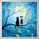 Deux chats assis sur une branche regardant la pleine lune avec un ciel bleu rempli d'étoiles. Les branches des arbres qui les entourent de petites fleurs jaunes. chat tuxedo noir et chat tacheté blanc et gris bicolore. Peinture acrylique Whimsical originale de Donna Leger. Tous droits réservés. ©dessins ironiques