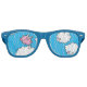 Lunettes de soleil avec un cochon rose avec des petites ailes blanches, dansant sur des nuages agrémentés de coeurs dans le ciel bleu vif.