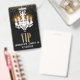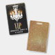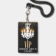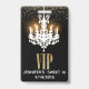 badge d'accessoire Chic Sweet 16 ou Quinceañera en noir avec des graphiques d'un lustre blanc qui s'illumine, et une parties scintillant dorée sur le dessus. Texte graphique en parties scintillant dorée : VIP. Le texte blanc, en bas, est prêt à être personnalisé pour le grand jour de votre fille.