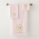 Cette serviette personnalisée est simple, moderne et luxueuse. Il dispose d'un arrière - plan rose rose ou brumeux avec un délicat monogramme de couronne botanique en or et typographie en écriture or pour votre personnalisation.