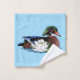 Un canard à bois dans l'eau avec un nénuphar blanc à côté du canard dans le fond abandonné de bleu