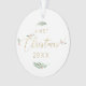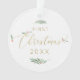 Notre ornement aquarelle est le souvenir parfait de votre premier Noël en couple marié! Le côté avant présente votre monogramme d'or en lettres de blocs modernes et votre nom centré. L'ensemble est encerclé dans la verdure de Noël aquarelle et les baies rouges avec des confettis d'or aspergé, ainsi que "M. + Mme." L'envers présente "Noël" dans la typographie dorée festive et l'année. #MrAndMrs #Keespake #FirstChristmas