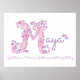Joli M initial / monogramme affiche de nom d'art parfait pour une chambre ou salle de jeux pour filles dans les tons violet, rose et jaune sur blanc. Personnalisez avec le nom de votre enfant commençant par M, et le nom signifiant une touche vraiment personnalisée à la chambre ou à la crèche de votre enfant, cet exemple est pour le nom Maya. Mignonne affiche idéale pour un nouveau bébé, un baptême ou un cadeau de baby shower. © Unique M monogramme coeurs et fleurs dessin description et graphisme par Sarah Trett. www.sarahtrett.com pour www.mylittleeden.com
