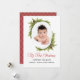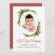 Célébrez le premier Noël du bébé avec une carte de vacances avec une photo de bébé préférée. Ce design a un cadre ovale agrémenté de pins à feuillage persistant et de cônes de pin avec un script rouge festif Mon premier texte de Noël. L'envers de la carte a un motif arlequin rouge et or coordonné. Personnalisez cette carte avec la photo de votre enfant. Vous pouvez éditer le texte de salutation de vacances avec le texte souhaité et vos noms.