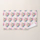 Serviette sertie à l'image délicieuse. 3 macarons colorés, roses, verts et bleus avec un bouquet floral rose et un soupçon d'aquarelle rose. Délicieux et élégant aussi ! Arrière - plan jaune clair.