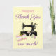 Un design vintage design de machine à coudre avec de jolis tissus et fils sur un arrière - plan citron pâle, avec le texte "Merci coudre beaucoup!" Une façon amusante de dire grâce de / à un couturier d'égout ou de la courtepointe. Parfait pour votre groupe de courtepointes ou de couture.