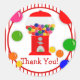 Ces autocollants ronds amusants et festifs font un bon sac de bonté merci autocollant pour les fêtes d'anniversaire des enfants! Le design comporte un arrière - plan rayé rouge et blanc. Au centre se trouve un cercle blanc avec garniture rouge. À l'intérieur du cercle se trouve une machine à gumball rouge remplie de gumballs colorés en rouge, bleu, vert, jaune, orange, rose et violet. Autour de la machine de gumball sont des gumballs de différentes tailles et couleurs. Sous la machine à gumball se trouve le texte en police rouge qui dit Merci!, cependant ce texte peut être customisé à vos besoins. Ces autocollants correspondent à notre Gumball Machine pour enfants Invitations de fête d'anniversaire, boutons de faveur de la fête, enveloppes et décoration de dessus de gâteau acrylique.